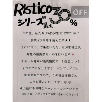 こんにちは、中村です!ただいま、J’ADORE(ジャドール)ではリスティコ商品が30%オフのキャンペーンを実施しています。キャンペーン期間も残り半分となりました。このチャンスをお見逃しなく!