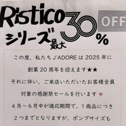 こんにちは、中村です!ただいま、J’ADORE(ジャドール)ではリスティコ商品が30%オフのキャンペーンを実施しています。キャンペーン期間も残り半分となりました。このチャンスをお見逃しなく!